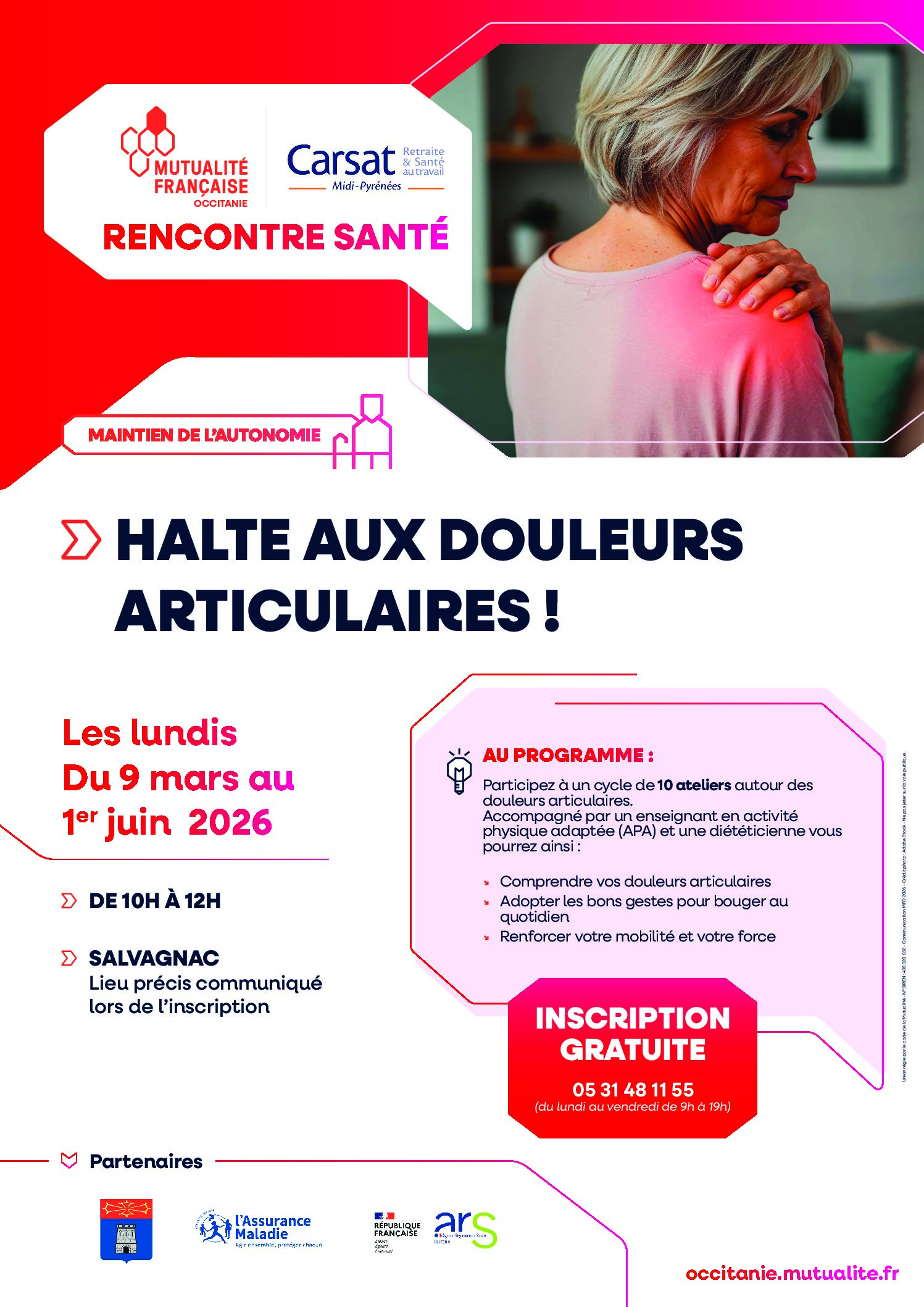 La Mutualité Française Occitanie, en partenariat avec la CARSAT Midi-Pyrénées et le CCAS de Salvagnac, lance un programme de prévention des douleurs articulaires. Ce cycle de 10 ateliers gratuits, destinés aux seniors, vise à prévenir