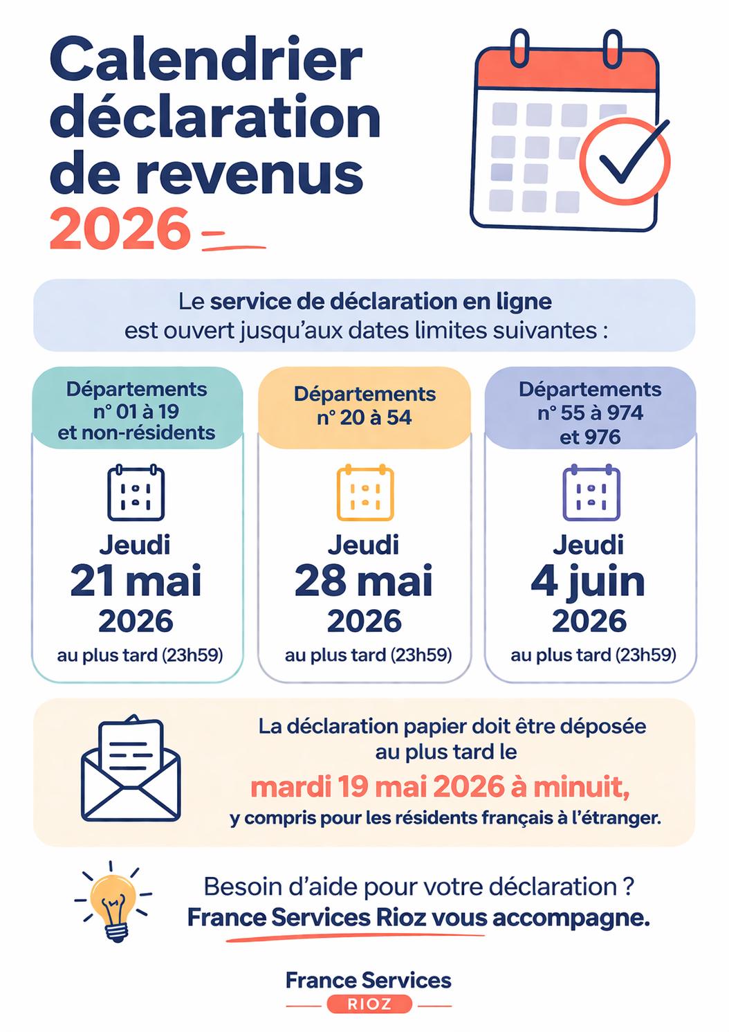 Impôt 2026 : lancement de la campagne de déclaration !La campagne de déclaration des revenus de 2025 est ouverte Pensez à effectuer votre déclaration en ligne dans les délais correspondant à votre département (voir l’affiche pour le détail). La déclaration papier reste possible, avec une date limite à respecter.