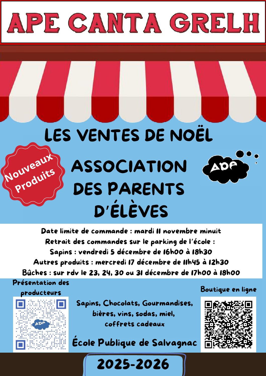 Comme l'année dernière l'Association des Parents d'Elèves de l'école Canta Grelh propose ses ventes de Noël :Ventes APE 2025 Noël Faites vos commandes!