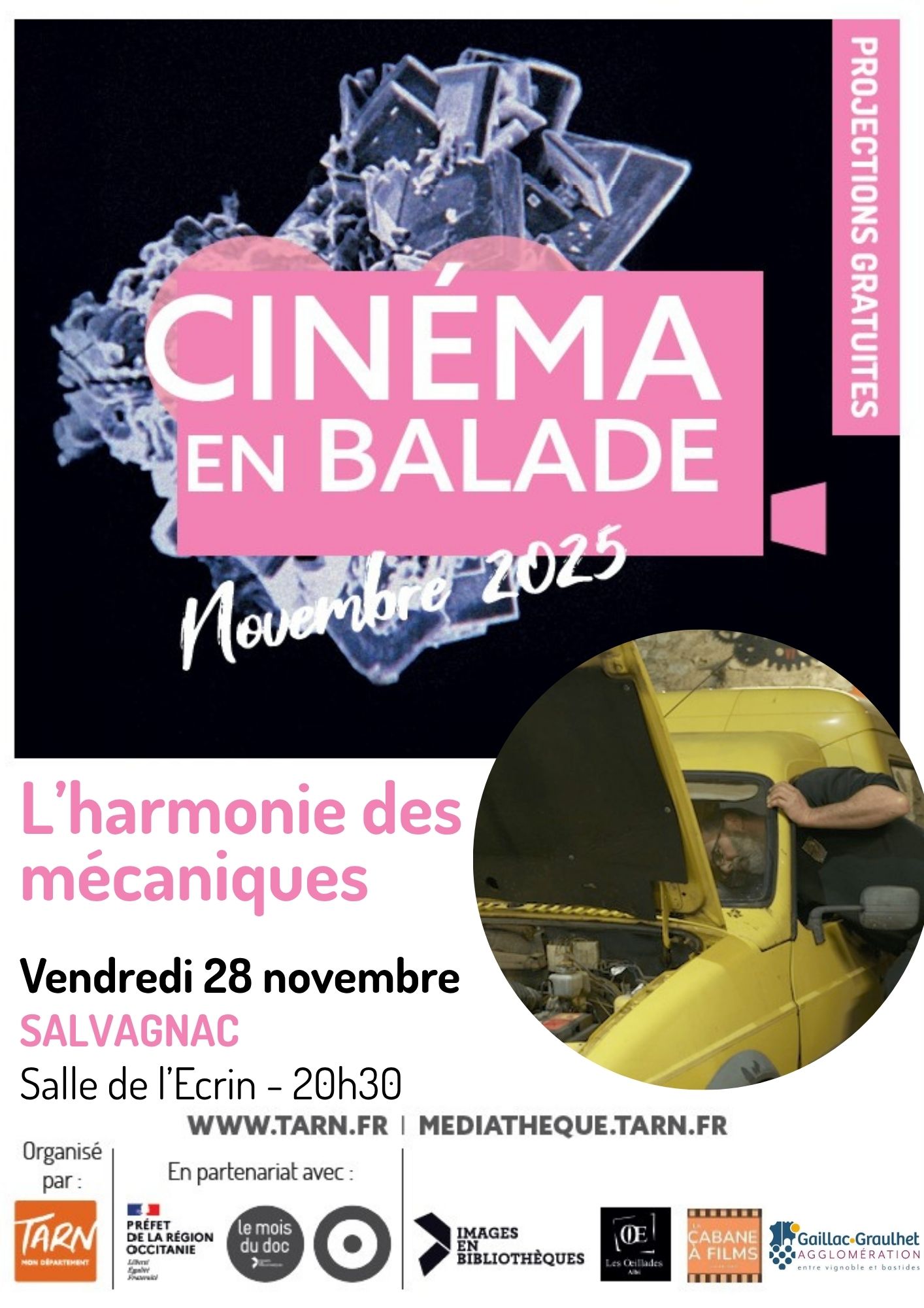 Voir les détailsEn collaboration avec la Médiathèque Départementale du Tarn, l'association culturelle du Pays Salvagnacois vous invite à une soirée cinéma à l'ECRIN le vendredi 28 novembre à 20h30. A première vue, Marc a tout d’un garagiste ordinaire. Artisan expérimenté et solitaire, il enchaîne les réparations automobiles dans son petit garage de la vallée de l’Hérault,…