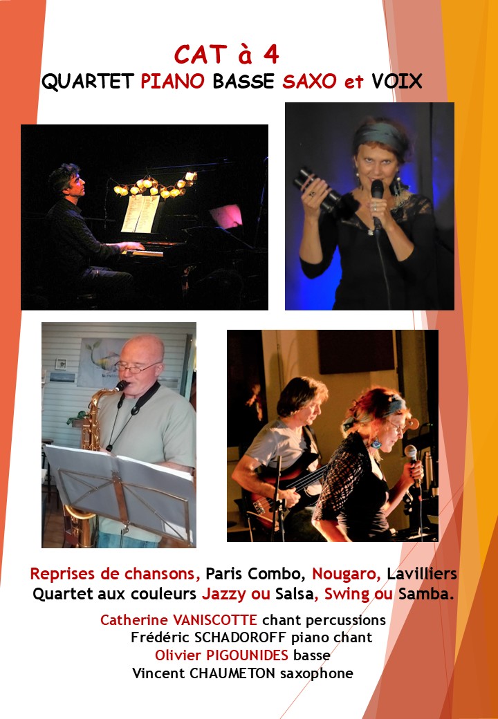 Voir les détailsUn rendez-vous joyeux DIM 29 MARS , notre quartet de chansons "CAT à 4" couleurs jazzy, swing, salsa et... suivi de "Les Jardiniers sont déchaînés" spectacle musical aux reprises bucoliques !....(Ricet Barrier, Dick Annegarn ...) Histoire de commencer à sortir de l'hiver pour aller vers le printemps Cat et ses musiciens vous accueilleront à…