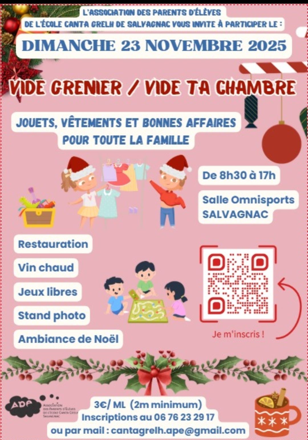 L'Association de Parents d’Élèves de l'Ecole Canta Grelh organise un vide-grenier/vide ta chambre le Dimanche 23 Novembre 2025 de 8h30 à 17h à la Salle omnisports.